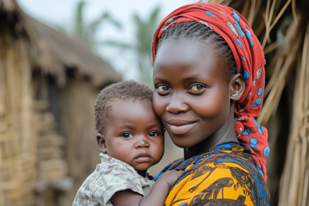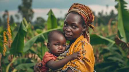 A woman gently holds her young child close, both displaying warm expressions. They are in a rural area with soft natural light filtering through greenery.
