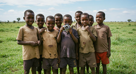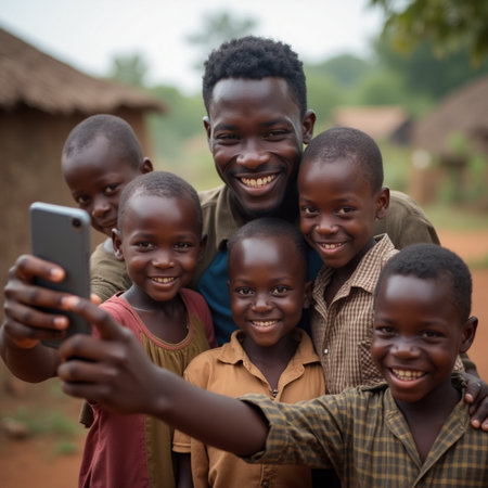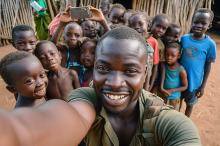 Male volunteer poses with children for selfies in an African village. Charitable assistance to children in need