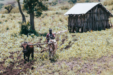 Southern Nations Region, Ethiopia - May 10, 2019: Unknown poor Ethiopian farmer cultivates a field with a traditional primitive wooden plow pulled by cows. May 10. 2019 in Southern Nations, Ethiopia