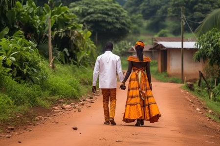 African couple in traditional wedding clothes walking at Africa town. Generative AI.