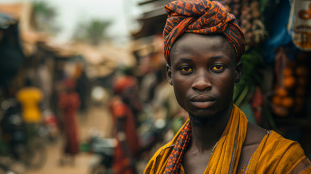 A compelling street portrait of a young man adorned in traditional face paint and vibrant attire, standing in a bustling African market street.