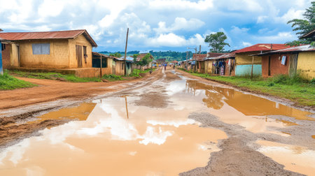Picturesque rural village street following a rainstorm, showcasing puddles reflecting the sky and simple homes lining the path, surrounded by lush greenery and a serene atmosphere.
