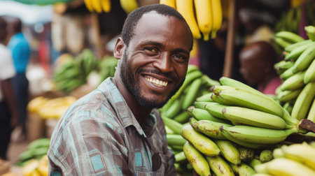 A man with a warm smile stands in a busy street market, surrounded by vendors and shoppers. The image captures the vibrancy and community spirit of the market.
