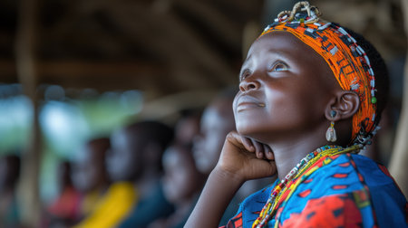 A young girl dressed in colorful traditional clothing listens intently at a community gathering showing curiosity and engagement in her surroundings.