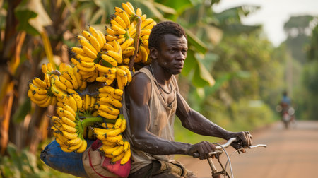 Unidentified Togolese man carries a bunch of bananas on his bicycle. Togo people suffer from poverty due to the bad economy