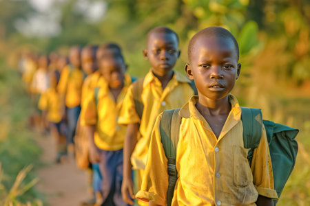 African schoolchildren in yellow shirts walking in a single file along a rural path, returning from school.