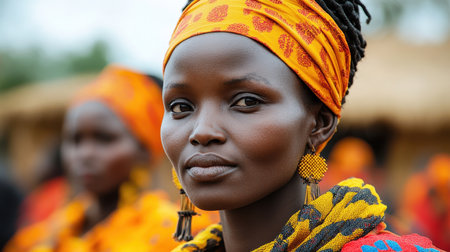 A young woman showcases her radiant beauty with a colorful headwrap and expressive eyes. She stands out among a vibrant group, celebrating cultural heritage with traditional clothing and joyful spirit.