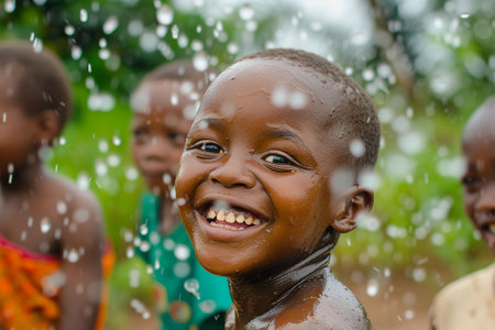 Happy little African boy playing in the rain. Children enjoy a heavy downpour in the arid African outback.