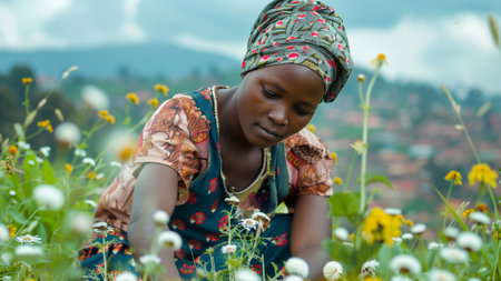 A photo of an afro american woman picking a flower at the field. Sustainable Development Goal 1, no poverty. Generative AI.