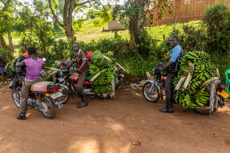 FORT PORTAL, UGANDA - MARCH 12, 2020: Motorbikes carrying bunches of matoke plantains in the crater lakes region near Fort Portal, Uganda