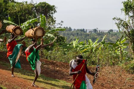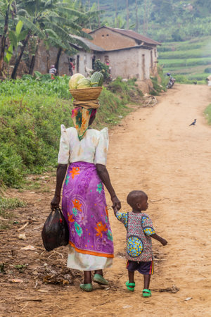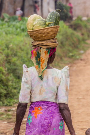 BUHUTU, UGANDA - MARCH 19, 2020: Local woman carrying basket of vegetables on her head in Buhutu town near Bunyonyi lake, Uganda