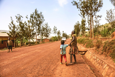 Kibuye, Rwanda, Africa - September 11, 2015: Unknown children. The car is going on dirt road and raising a cloud of dust. The African young girl is keeping her brother’s arm and tugging at his arm.