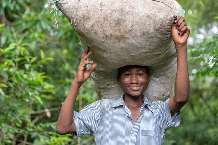 BOABENG, GHANA - JAN 15, 2017: Unidentified Ghanaian woman carries a basin on her head in the local village. Ghana people suffer of poverty due to the bad economy.