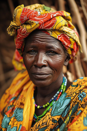 Smiling African elder in a rural community setting. Cultural wealth and community leader concept for design and print