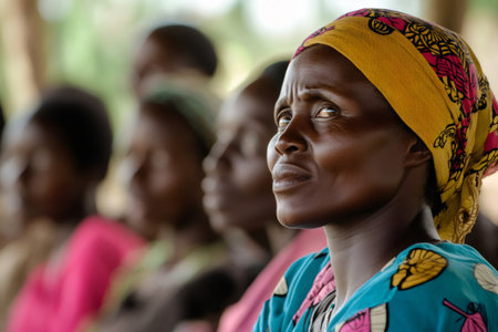 African woman listening intently in a rural community gathering, focusing on themes like development, empowerment, and education