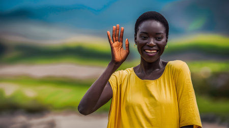 A woman in a yellow shirt waving her hand with the sun behind it, AI