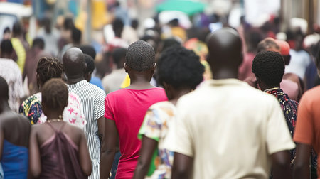 A diverse group of individuals moves through a bustling street, showing the daily life and challenges faced by the population.