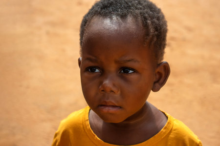 BOABENG, GHANA - JAN 15, 2017: Unidentified Ghanaian little boy stands in the local village. Ghana children suffer of poverty due to the bad economy.