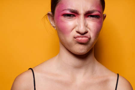 Sexy brunette woman bright makeup posing fashion emotions yellow background unaltered