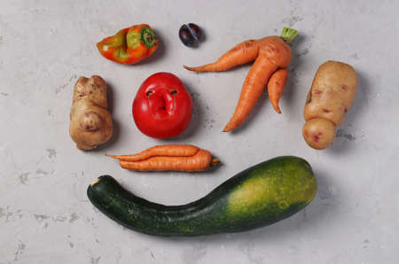 Trendy Ugly Organic Vegetables: potatoes, carrots, tomato, pepper, zucchini and plum on gray background, ugly food concept, horizontal format, top view