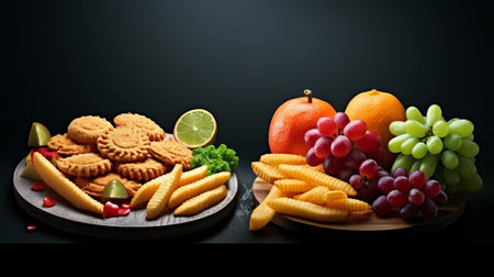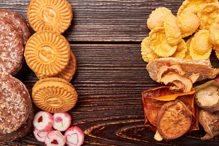 Different kinds of biscuits with fruits and vegetables on a black background.