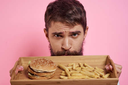 Man with a tray of food in his hand hamburger fries and fast food calorie pink background portrait close-up