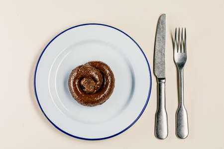 Plastic excrement lies on a plate between a fork and a knife close-up. The concept of an inept cook, fake news, shitty restaurant, bad food, taste of shit.