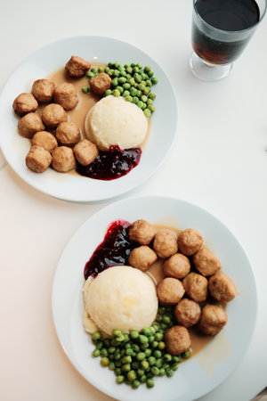 Overhead view of two identical plates of Swedish meatballs with mashed potatoes, peas, gravy, and lingonberry sauce beside glasses of soda