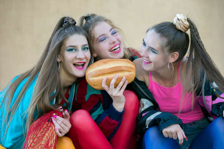 Three pretty girls dressed in the style of the nineties are sitting on the steps and sharing a roll.