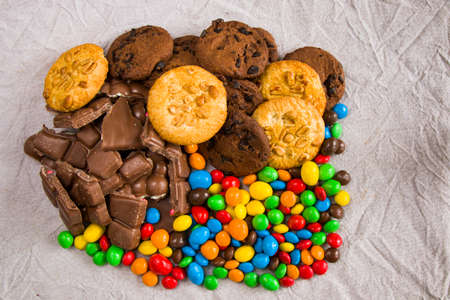 Unhealthy products. food bad for figure, skin, heart and teeth. Assortment of fast carbohydrates food with candy