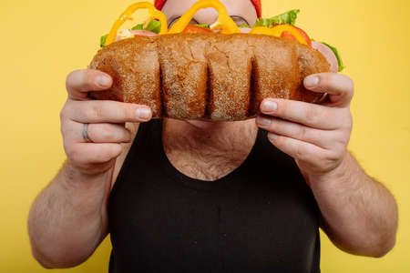 Man with hamburger in the hands of fast food diet food white t-shirt close-up yellow background