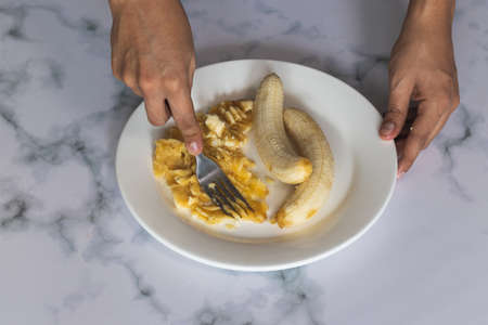 A female with a fork crushes bananas in a white plate making banana bread in the kitchen
