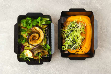 Healthy food plan daily ready menu on black background, fresh meals in paper boxes on gray background as home delivery service in office, flat lay, website photo banner