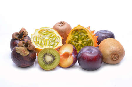 Various fruits: kiwano mangosteen plums and kiwi on white background