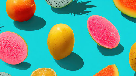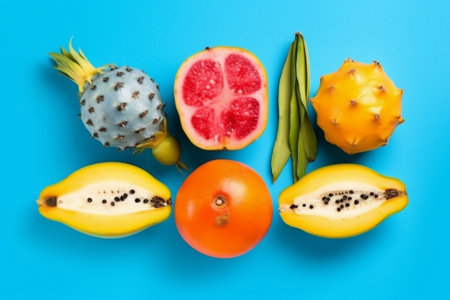 Generative AI : Assortment of tropical exotic fruits Blue background Top view