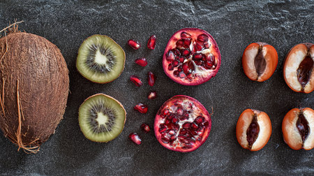 A variety of fruits and berries are arranged on a dark surface