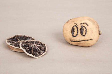 Close-up of old medlars lying side by side against dark background. The medlars are wrinkled and dry.