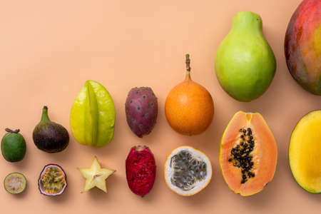 Fresh tropical whole and halved fruits on a beige background making a row.