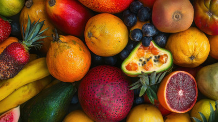 A vibrant assortment of tropical fruits showcases a rich and colorful variety, perfect for highlighting freshness and healthy eating in culinary projects.