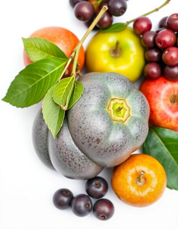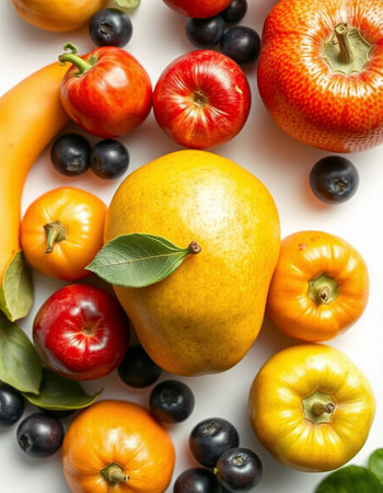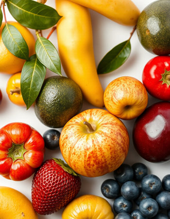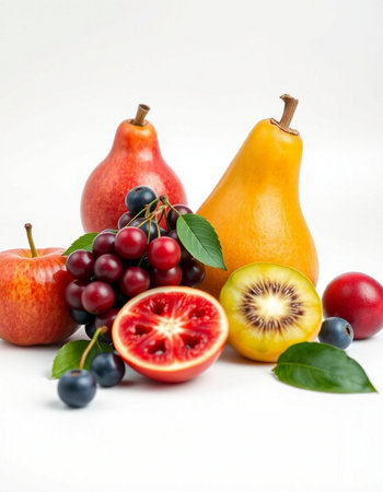 A colorful assortment of fresh fruits on a white background.