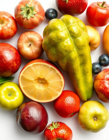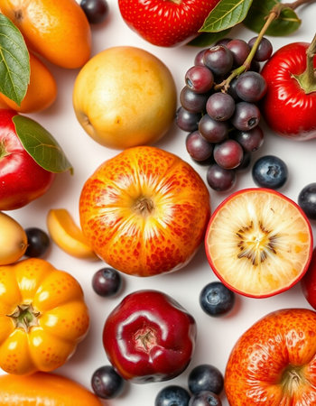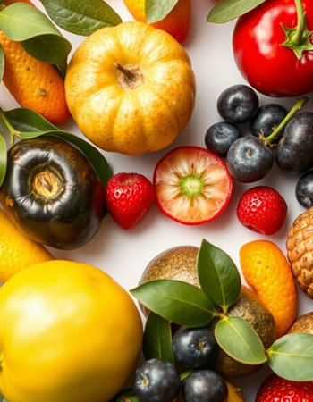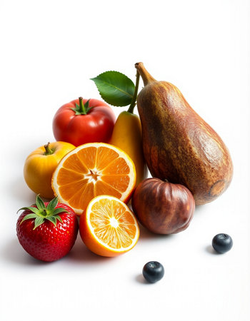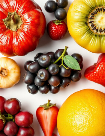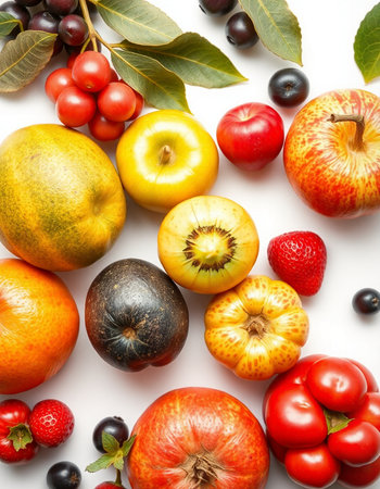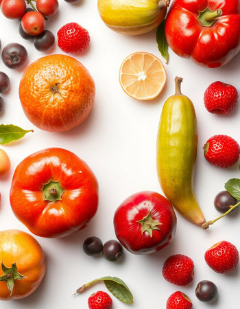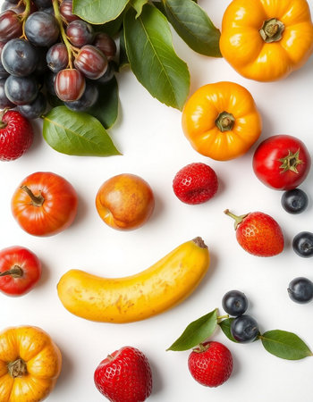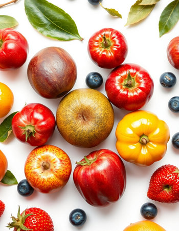 Fruits and vegetables on a white background, close-up.