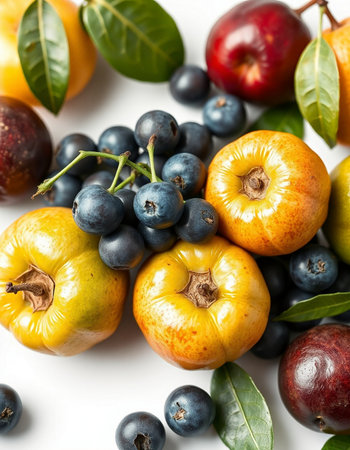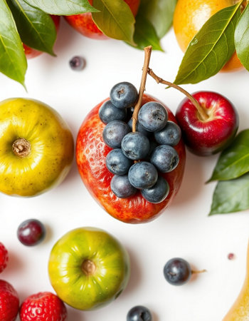 Fruit composition with apples, pears and blueberries on white background