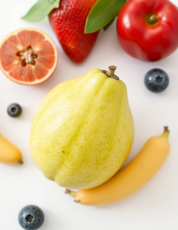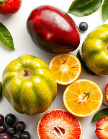fresh fruits on white background, top view, close-up.