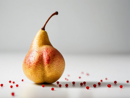 AI Generated. A Ripe Yellow Pear with Red Spots Hovering Above a White Surface
