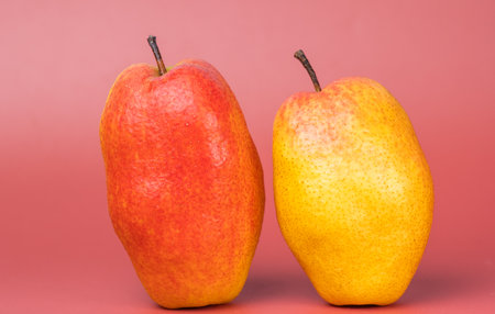 Two pears, one green and one red, are displayed in a studio setting highlighting their natural texture Perfect for healthy eating or product photography.