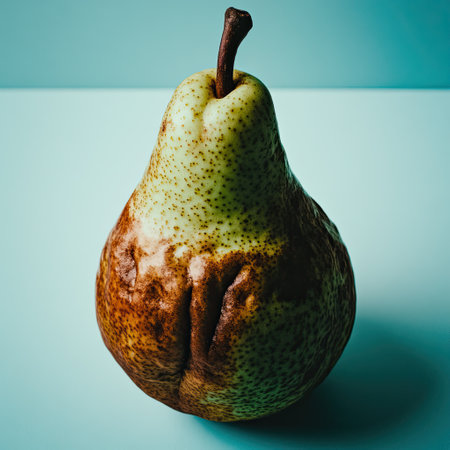 A speckled pear stands on a vivid green surface, highlighting its irregular shape and natural blemishes. The contrast emphasizes the fruit's vivid colors and textures, celebrating its uniqueness.
