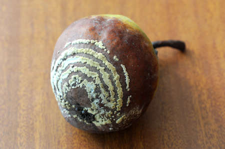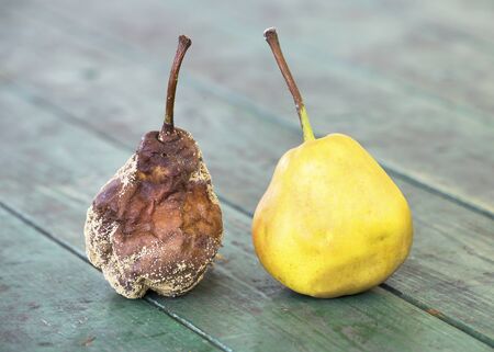 Moldy and healthy fresh pear fruits food on the table