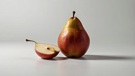 Studio shot of a whole and halved pear on a table providing a clean and natural aesthetic ideal for food and wellness content.