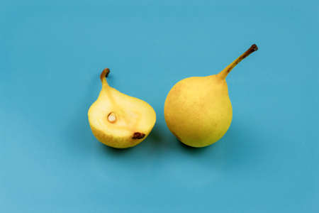 Yellow pears on a blue background. One cut in half