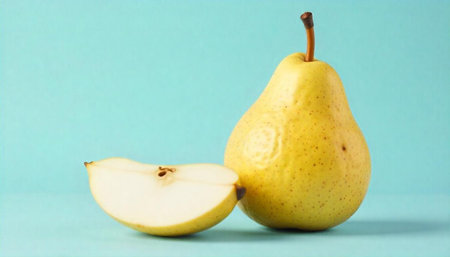 Fresh yellow pear with slice on light blue background